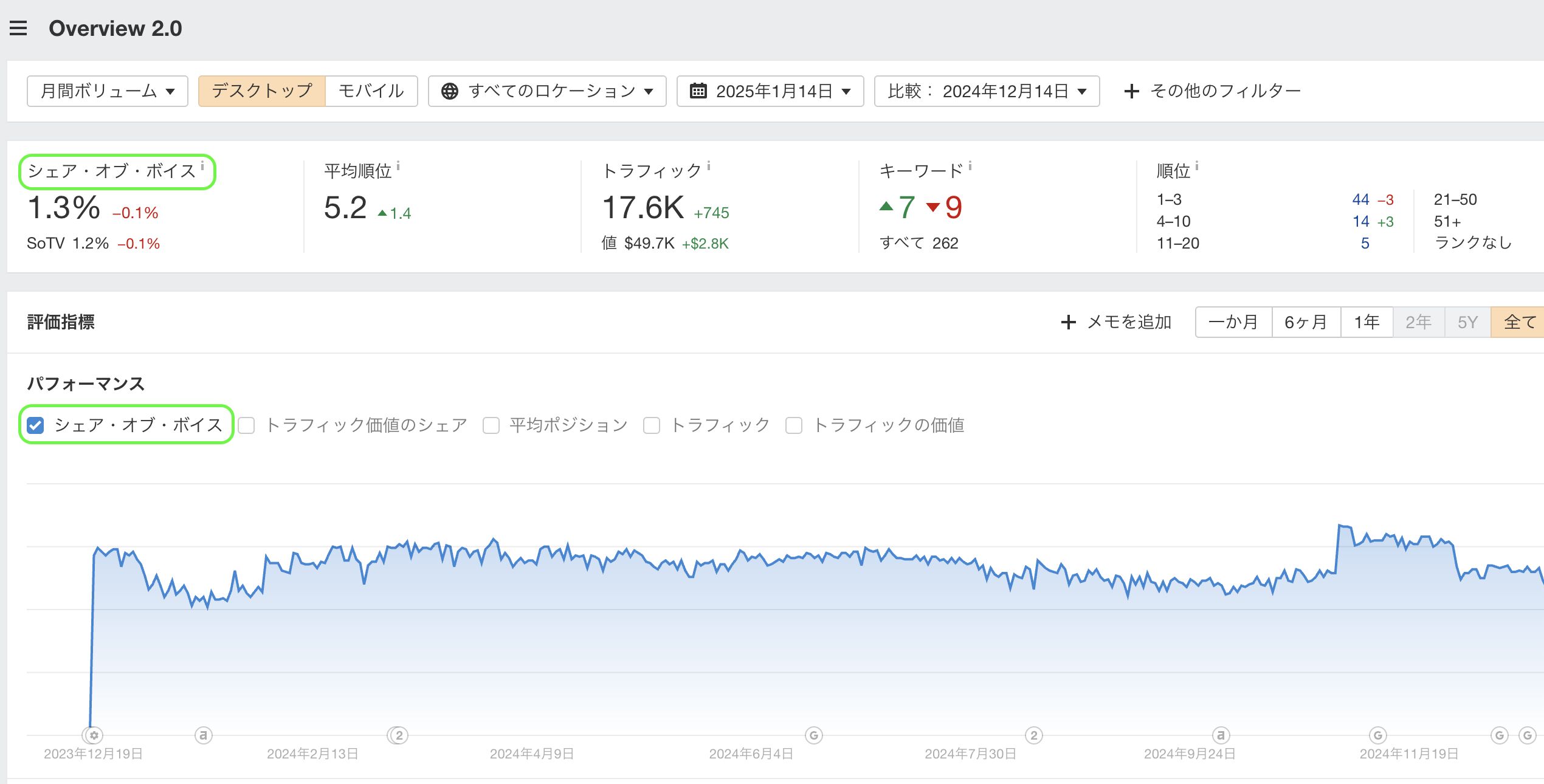 「Dashboard」 > 「ランクトラッカー」にアクセスすることで、Share of Voice(SoV)と Share of Traffic Value(SoTV)指標を確認可能。これにより、ブランドの人気度やオーガニック検索での可視性を測定できます。