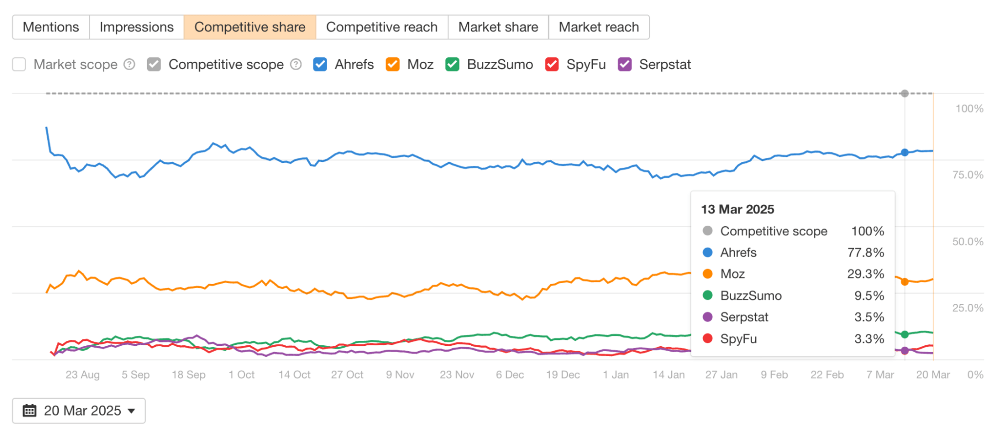 Ahrefs ブランドレーダーを活用すれば、現在の AI による概要におけるトピック所有率をベンチマークできます。また、長期的なトレンドを追跡することで、関連性の高いブランド言及を増やすために効果的な戦略を見極めることができます。