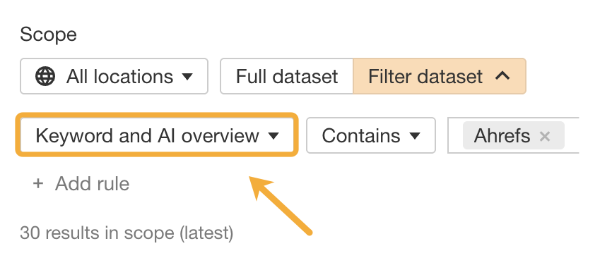 今、ブランドの認知度を完全に把握するには、「AI による概要」で自社が表示される頻度を知っておく必要があります。Ahrefs では、以下の手順で簡単に調査ができます。