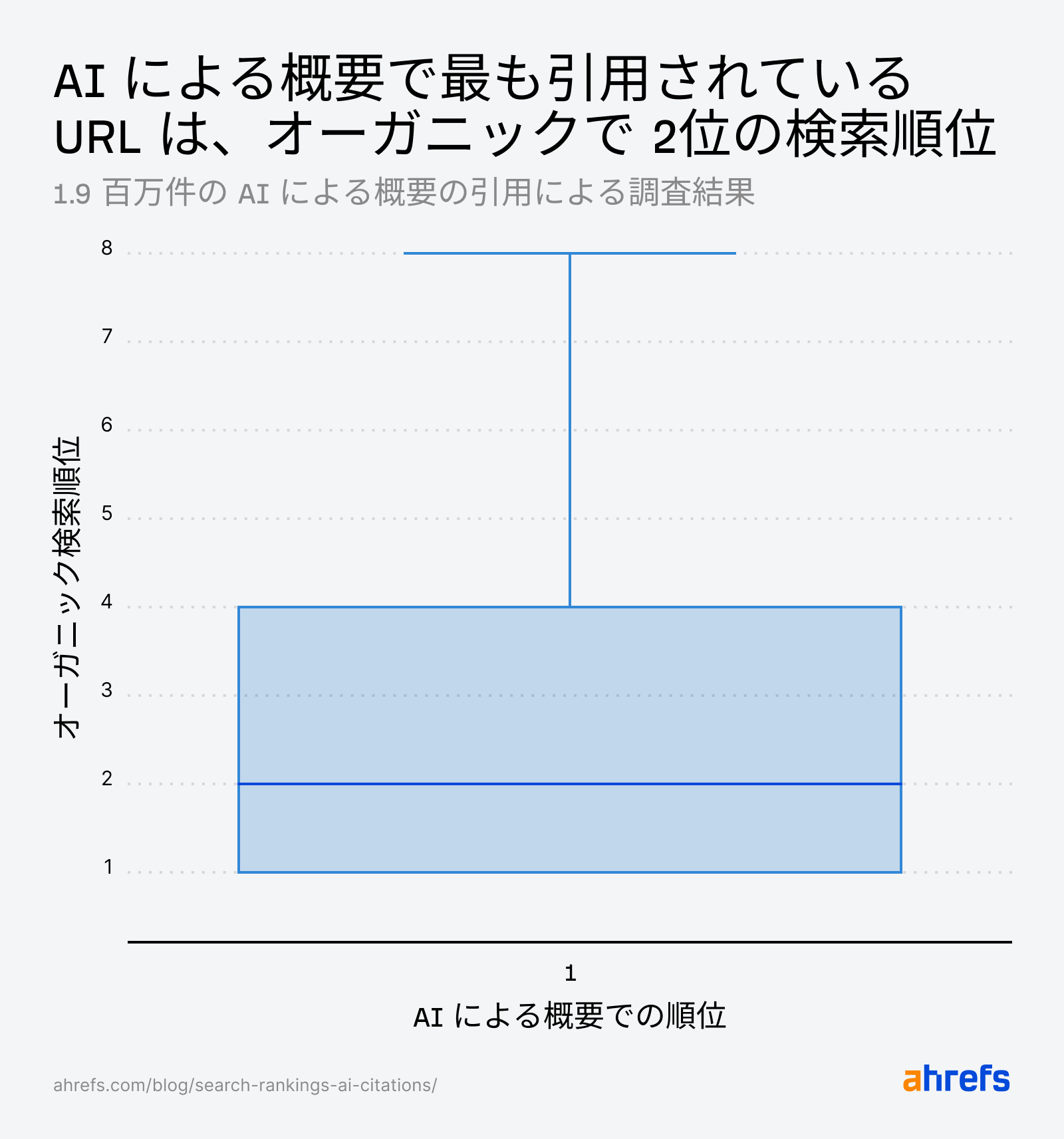 Ahrefsが 190 万件の AI による概要における引用データを分析したところ、その 76% は従来の検索結果でも上位 10 位以内にランクインしており、最も多く引用されている URL の中央値は 2 位でした。
