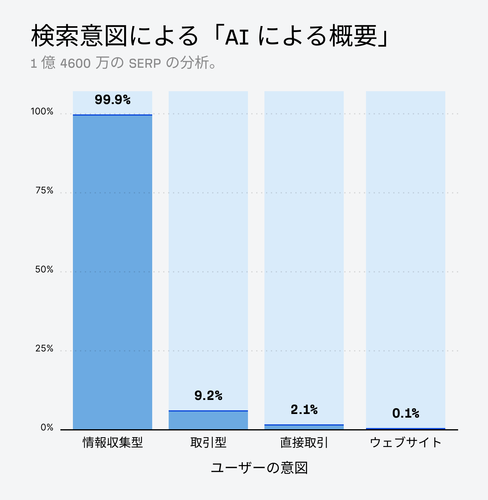 一方で、AI による概要が表示されるキーワードの 99.9% は情報収集目的(インフォメーショナル)なものです。