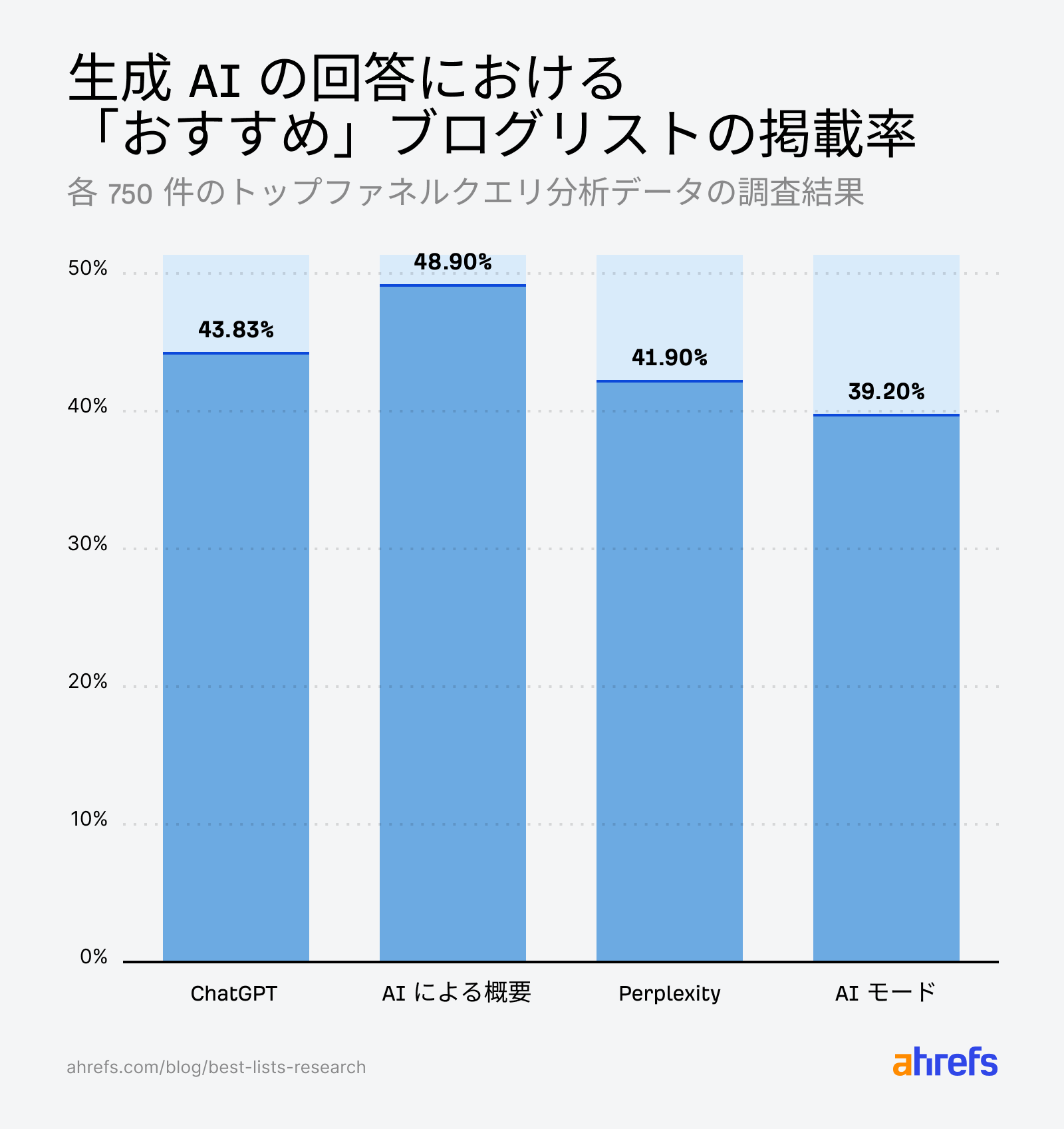 Ahrefs の調査では、ブランドメンションは AI による概要での可視性と最も強く相関する要因であることが分かっています。