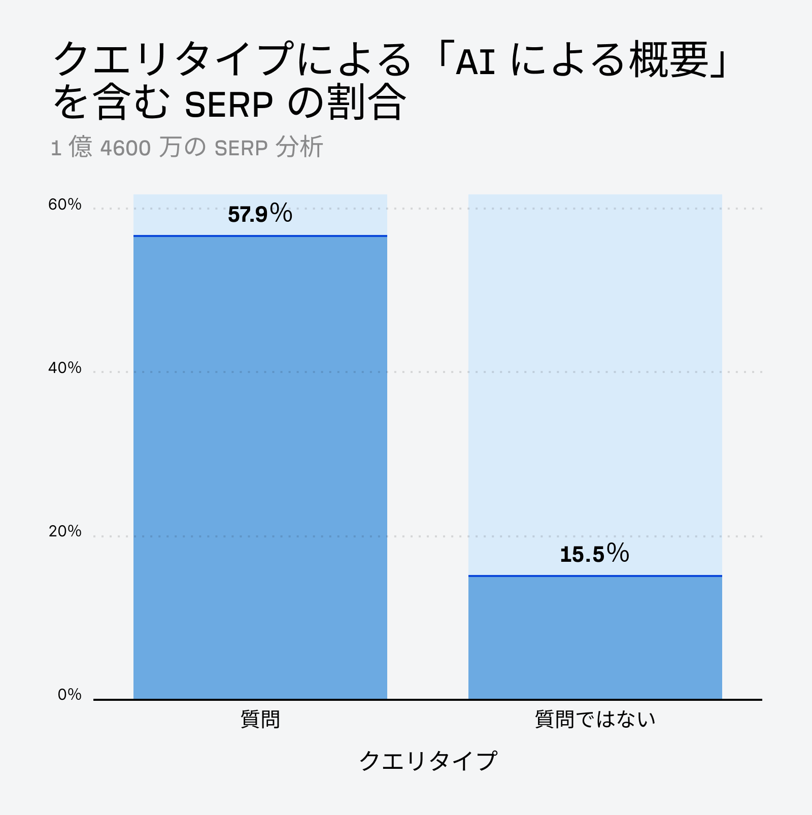 たとえば、質問形式のクエリでは、AI による概要が 57.9% の割合で表示されています。