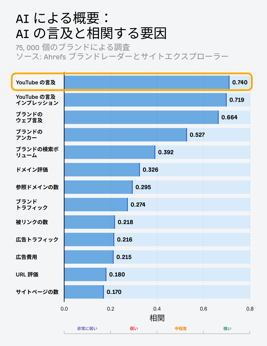 Ahrefs 最新のブランド要因調査では、YouTube でのメンションが AI による概要の可視性と最も強い相関関係にあることがわかりました。