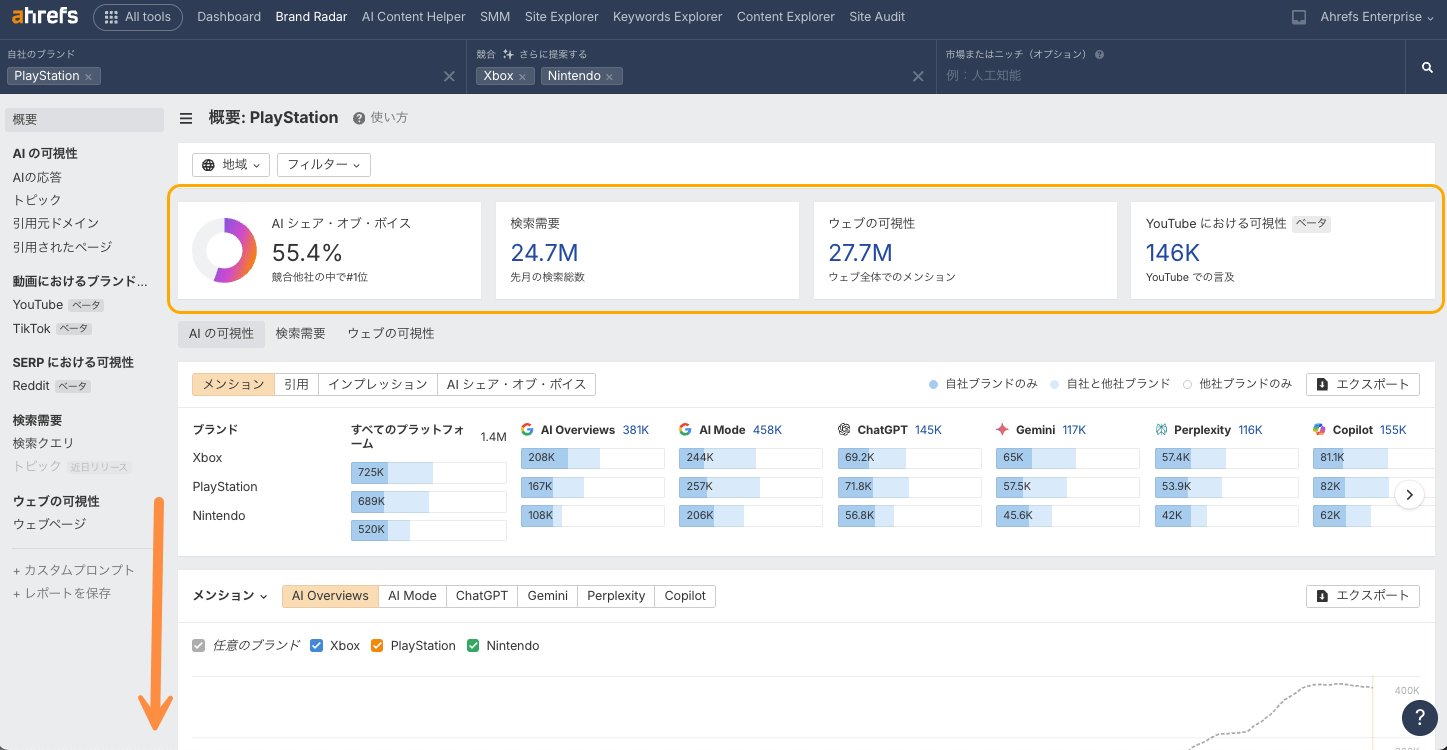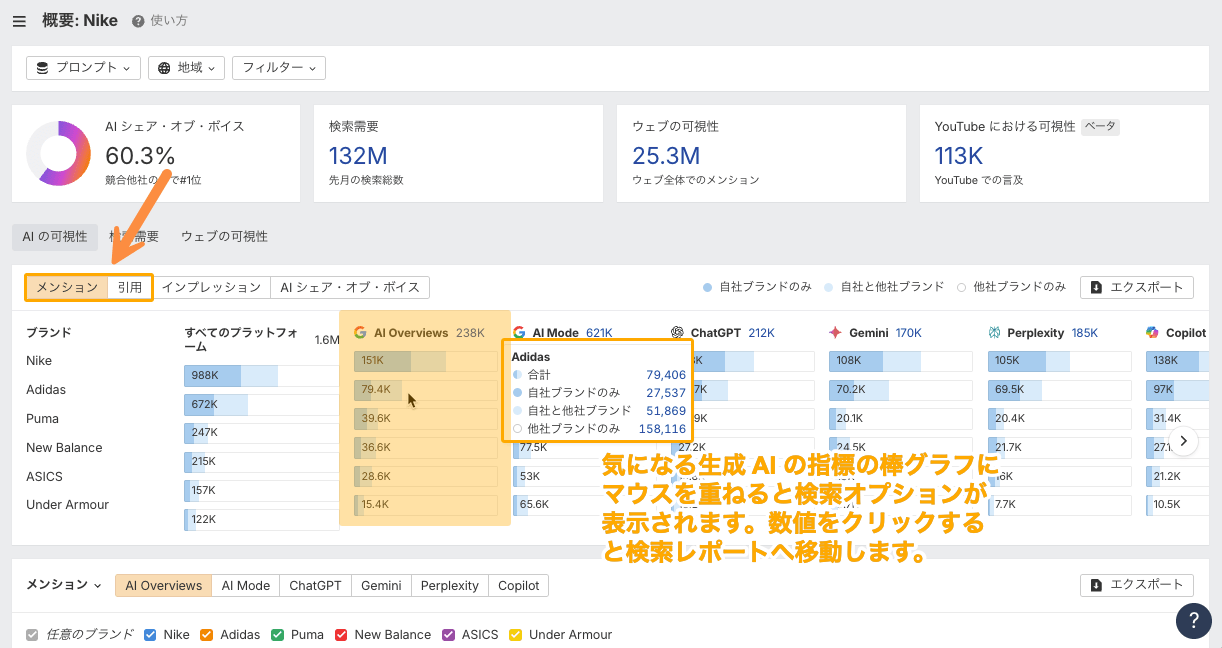 - 自社と競合のブランド名が AI 検索、動画などの露出状況を可視化する。