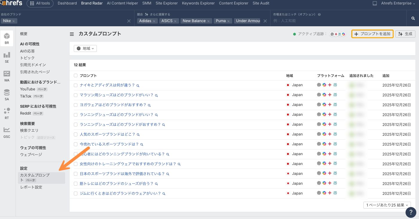 - カスタムプロンプトの設定開始「ブランドレーダー」に戻り「+ カスタムプロンプト」をクリックする。