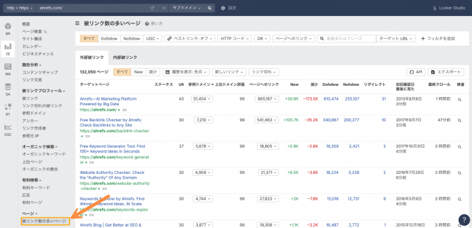 - 「被リンク数の多いページ」から自社が獲得されている被リンク数が多い順で表示されます