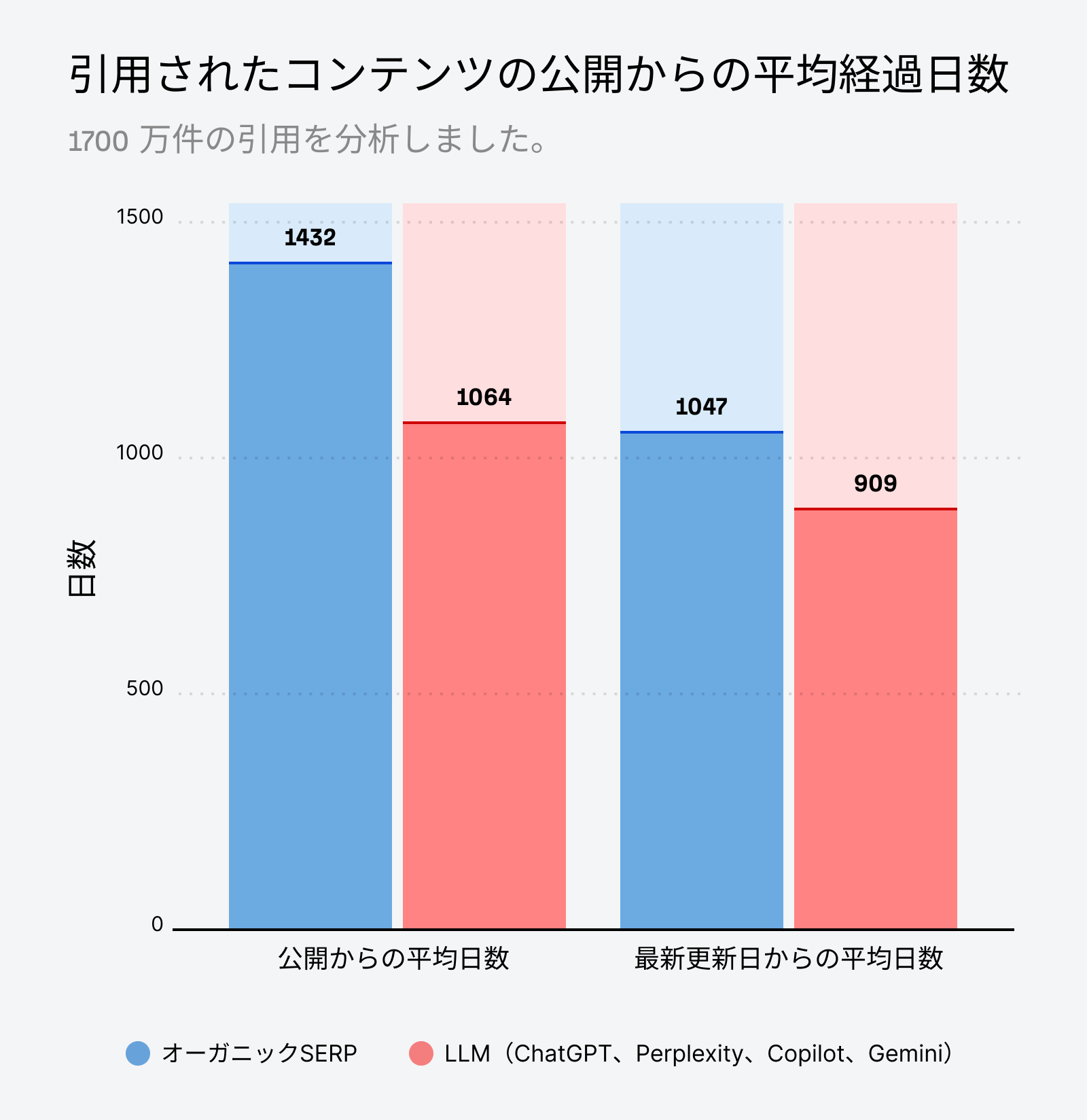 Ahrefs の分析では、最近公開されたページ、または頻繁に更新されるページが明らかに好まれていることが判明しました。LLM は、引用元を選ぶ際、特に情報の鮮度が肝心なトピックについては、ページの新しさを重要な判断要素としているようです。