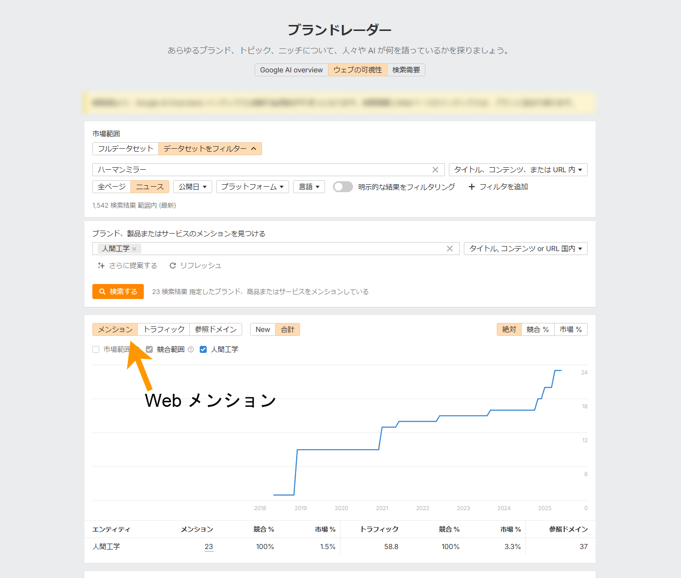 Ahrefs ブランドレーダーを使用すると、ウェブ言及、ウェブ言及トラフィック、市場シェア、AI Overviews のオーナーの増加を追跡できます(詳細は後述します)。