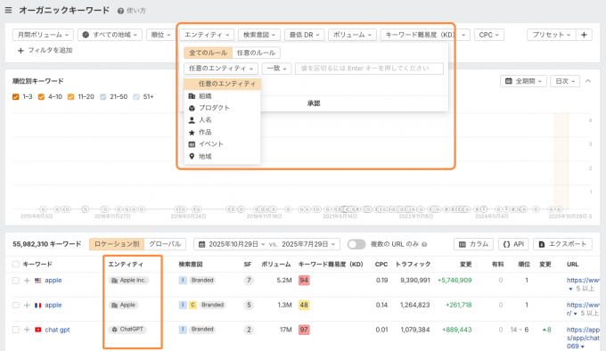 各キーワードがどのエンティティに属しているかを一覧で確認できるようになり、特定のエンティティでフィルタリングすることも可能になりました。