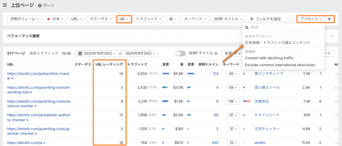 また、「URL レーティング」の指標が上位ページレポートにも追加されました。並び替え、フィルタリング、API 経由でのアクセスが可能になり、ページの強さを一目で把握できます。