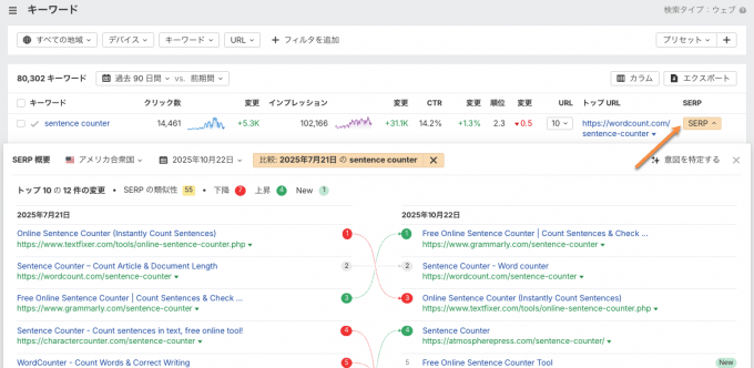 GSC キーワードレポートでサイトエクスプローラーの SERP 概要を直接表示できるようになり、自社と競合の順位を確認できます。タブを切り替える必要はありません。