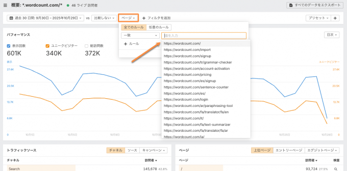 また、ページフィルターに複数の URL を入力することができるようになりました。複数ページを一度に分析する際に便利な機能になります。