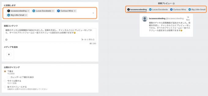 複数のチャネル投稿機能が追加されました。投稿を作成し、チャンネルごとにプレビューをしてから、すべてのプラットフォームに一括でスケジュール設定または投稿できます。