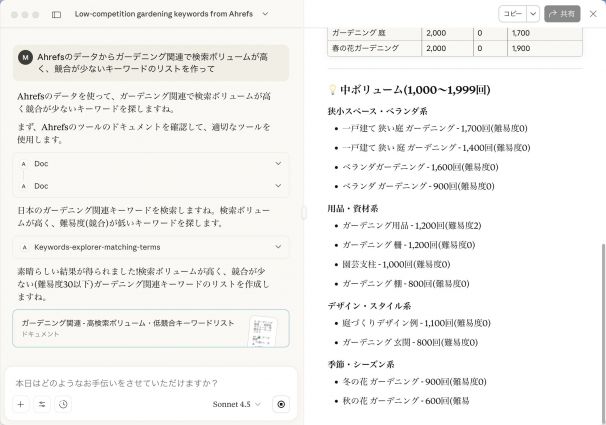 簡単なデモを Claude へ質問してみます。「検索ボリュームが高く、競合が少ないガーデニング関連のキーワードを探して」とプロンプトを入力すると、MCP プラグインが接続され、クエリを実行し、リアルタイムデータを提供します。