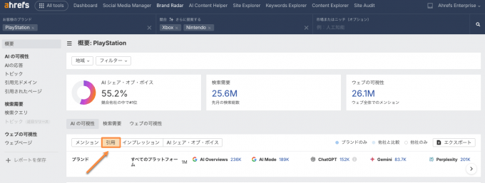 概要ページには、新しい引用チャートが追加されました。言及と引用は名前のバリエーションでマッチングされ、インプレッションと AI シェア・オブ・ボイスは名前のバリエーションまたは URL でマッチングされます。