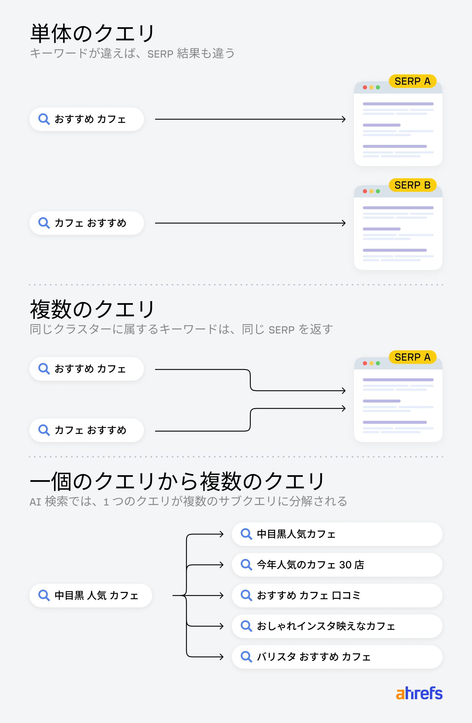 しかし、AI 検索はこのモデルを 1 対多に変えました。1 つの検索を複数に展開して、AI モデルが関連するコンテキストを得られるよう支援するのです。この技術がクエリファンアウトと呼ばれるものです。