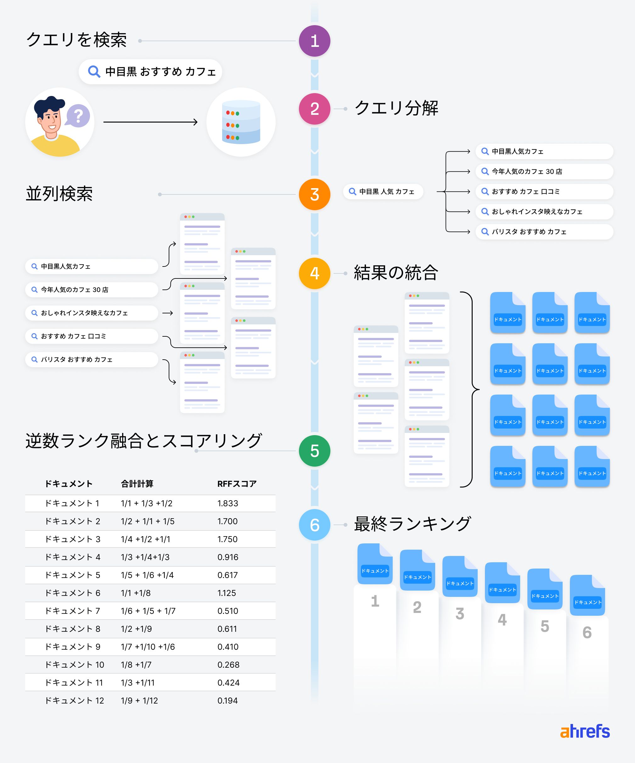 - スコアリング:各ドキュメントは、元のクエリとの関連性とリスト間での順位に基づいてスコアが付けられます(例:あるリストで 2 位、別のリストで 5 位にランクインした場合、1/2 + 1/5 のスコアになります)。複数のリストに表示されるドキュメントは、より高いスコアを蓄積します。