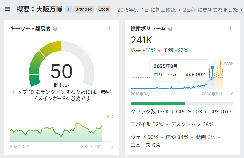公式サイトや自治体、企業、ニュースからの被リンクが非常に高く、チケットやパビリオンなどの関連市場も含めると最低でも月間 50 万件以上の巨大市場でした。