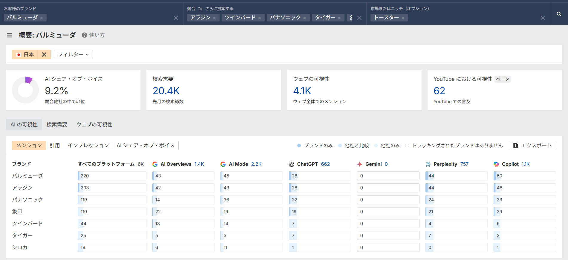 バルミューダは、AI プラットフォーム全体でのメンション数は 220 件と競合の中でも最大級で、Google の AI による概要や ChatGPT など複数の AI ソースでも安定して取り上げられています。
