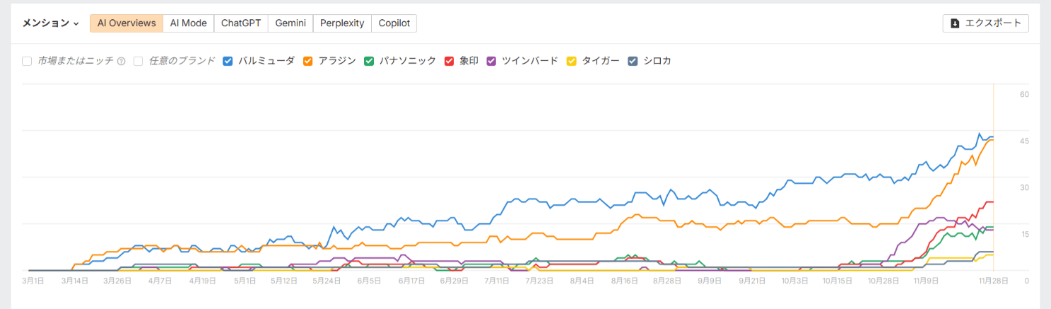 AI に名前が挙がるブランドと検索されるブランドは必ずしも一致しませんが、依然として話題の中心はバルミューダとアラジンにあることが分かりました。