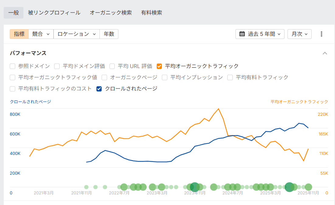 Ahrefs エクスプローラーで同サイトを検索すると、ある興味深い傾向が見えてきます。オーガニックトラフィックは、過去のピーク時と比べて大きく減少しているにもかかわらず、ここ数年でクロールされているページ数は着実に増加。つまり、このサイトは継続的にコンテンツを増やし続けているのです。