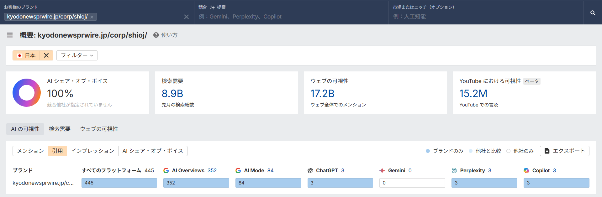 ブランドレーダーの検索結果を見てみると、検索需要・ウェブ上での可視性のいずれも非常に高い水準にあることが分かります。検索需要が高いということは、それだけブランド名を“指名して”検索するユーザーが多いことを意味しています。これは、認知度だけでなく、信頼や興味の高さを示す重要な指標です。それと同時に、AI からの引用が増えている点も注目ポイントです。