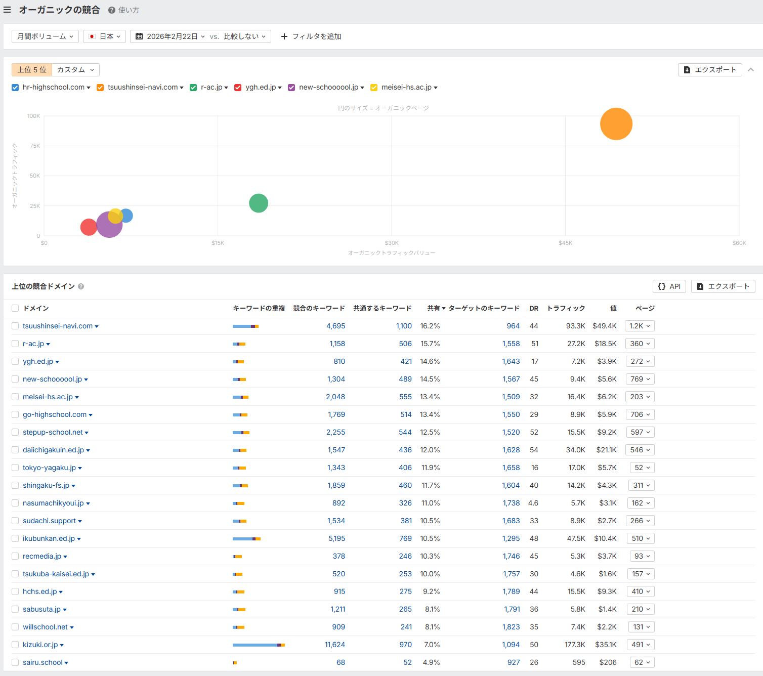 また、画面の上部には、縦軸をオーガニックトラフィック、横軸をオーガニックトラフィックバリュー※1、円の大きさをオーガニックページとするバブルチャートが表示されます。