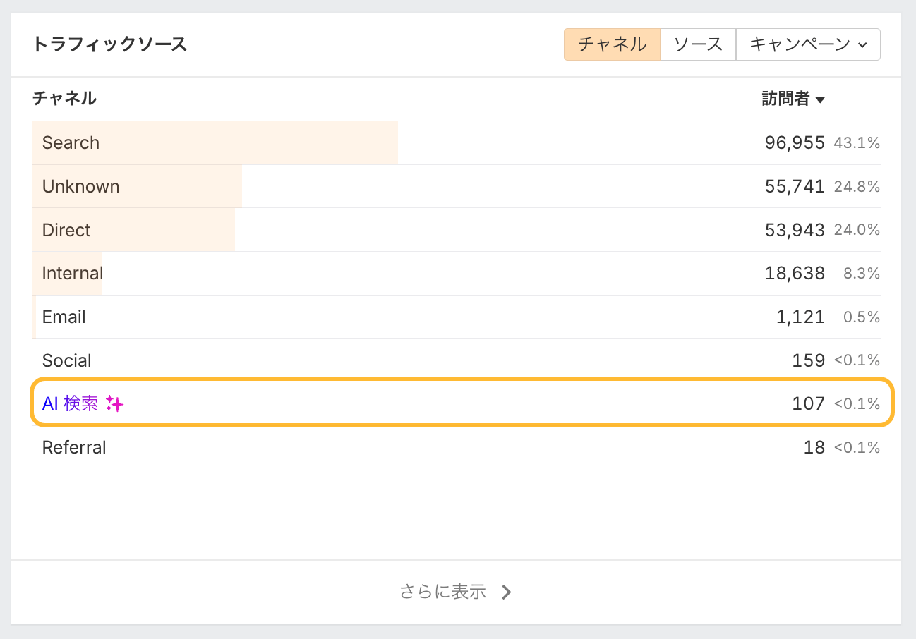 次に、Web サイトのトラフィックソースウィジェットに移動して、AI 検索をクリックします。あなたが参照している主要な AI プラットフォームすべての分類と、最も AI トラフィックを生み出しているページが表示されます。