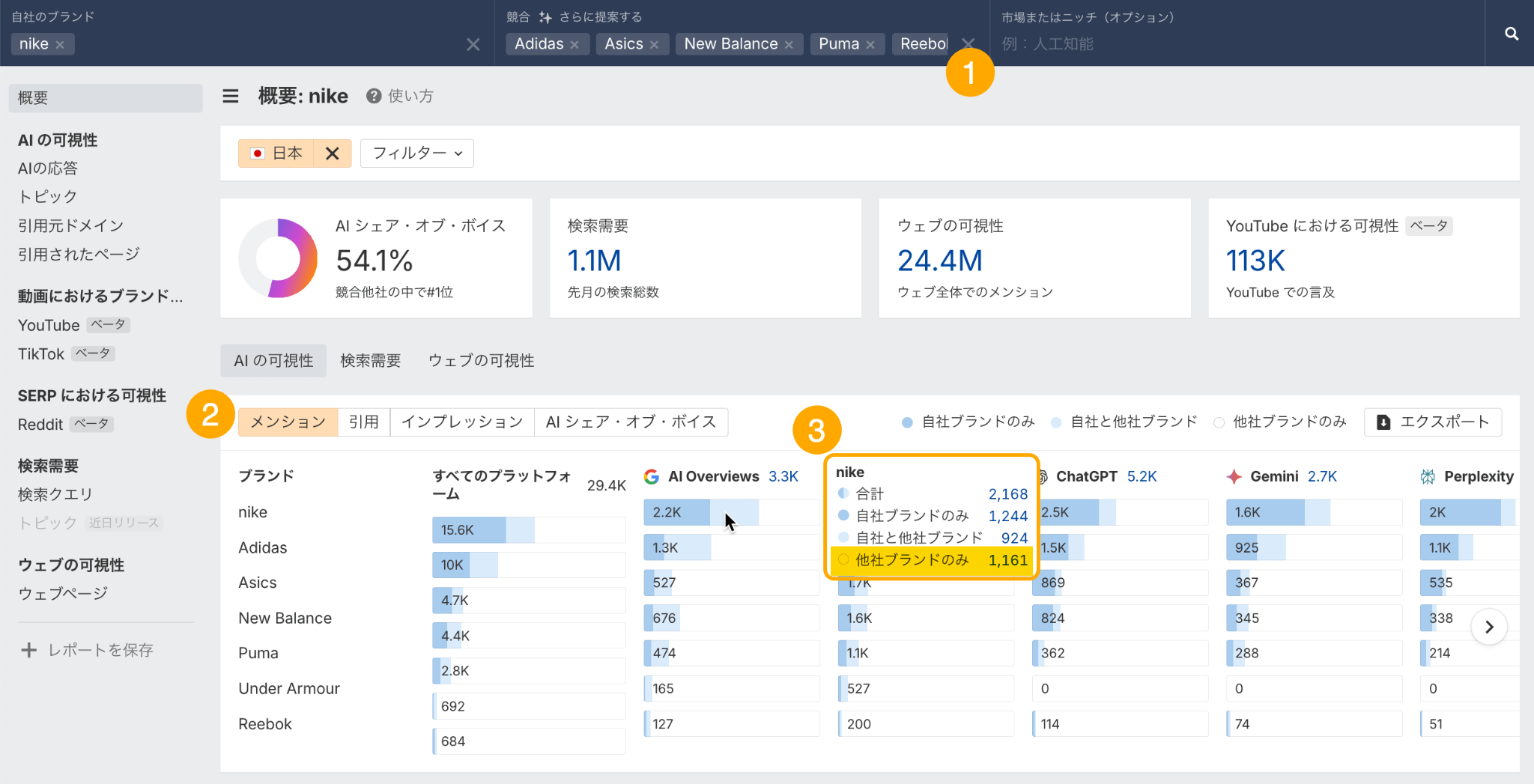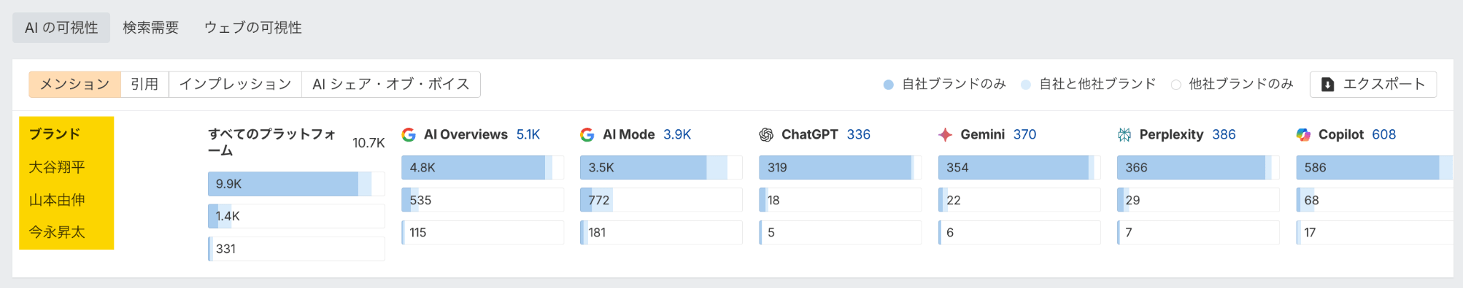 AI 言及のギャップ(競合他社は言及されているが自社ブランド名が言及されていない)を見つけるには、ブランドレーダーで競合他社を追加し、メンションがチェックされていることを確認し、ブランドの任意の AI インデックスにカーソルを合わせて、「他社ブランドのみ」をクリックします。