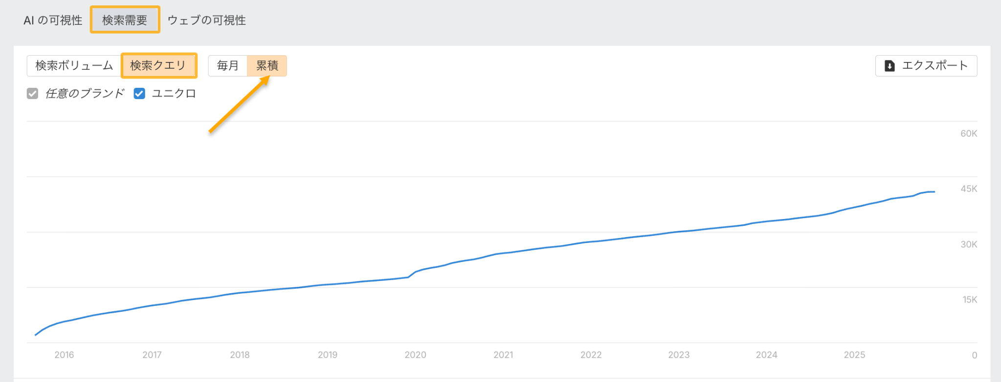 最近のブランドキャンペーンが機能しているかどうかを確認するには、ブランドレーダーを使い、累積で検索需要グラフを確認してください。