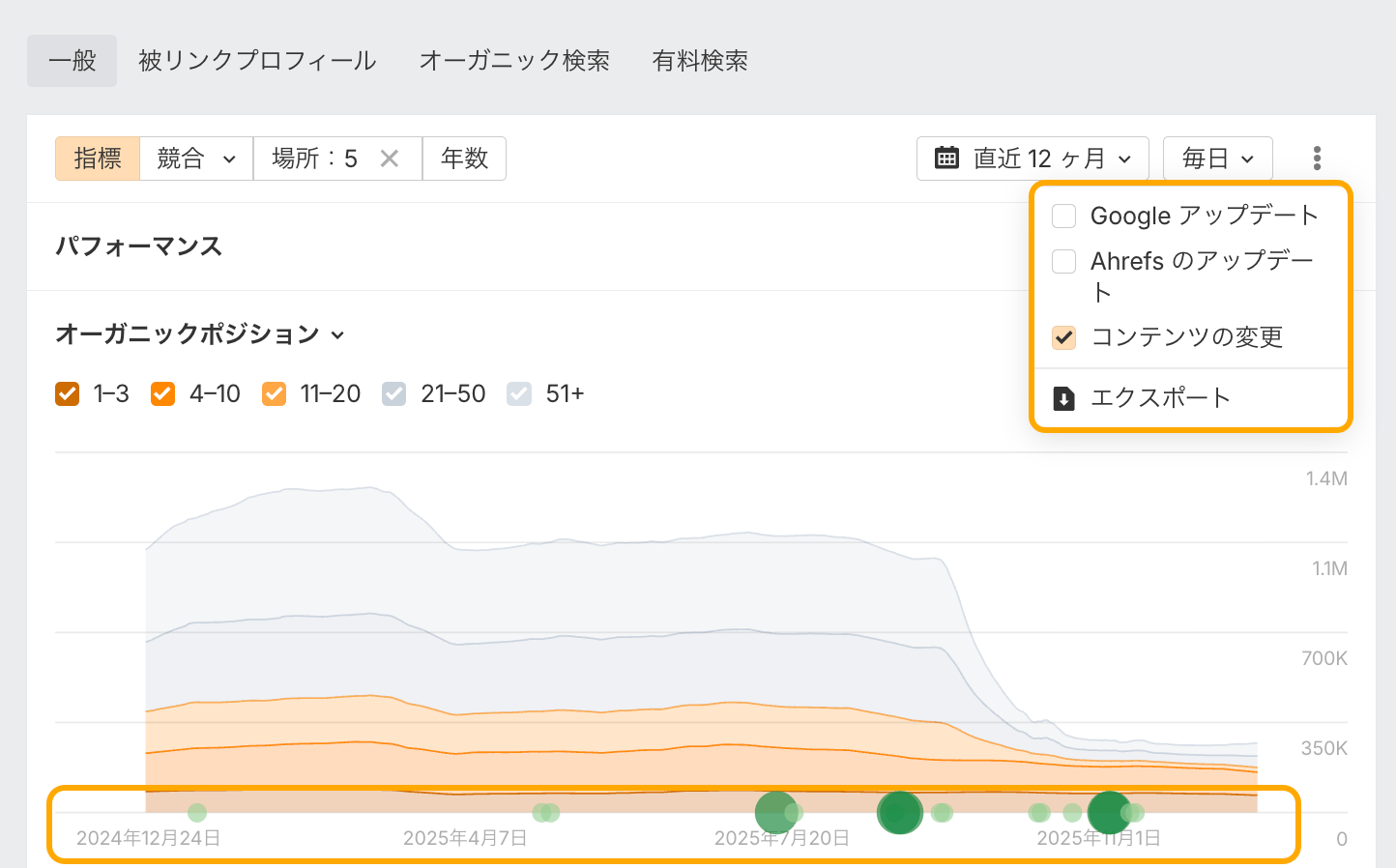 これは、サイトエクスプローラーのパフォーマンスチャートで「コンテンツの変更」チェックボックスを切り替えて確認できます。次に、コンテンツの変更と実際のトラフィック減少を相関させます。