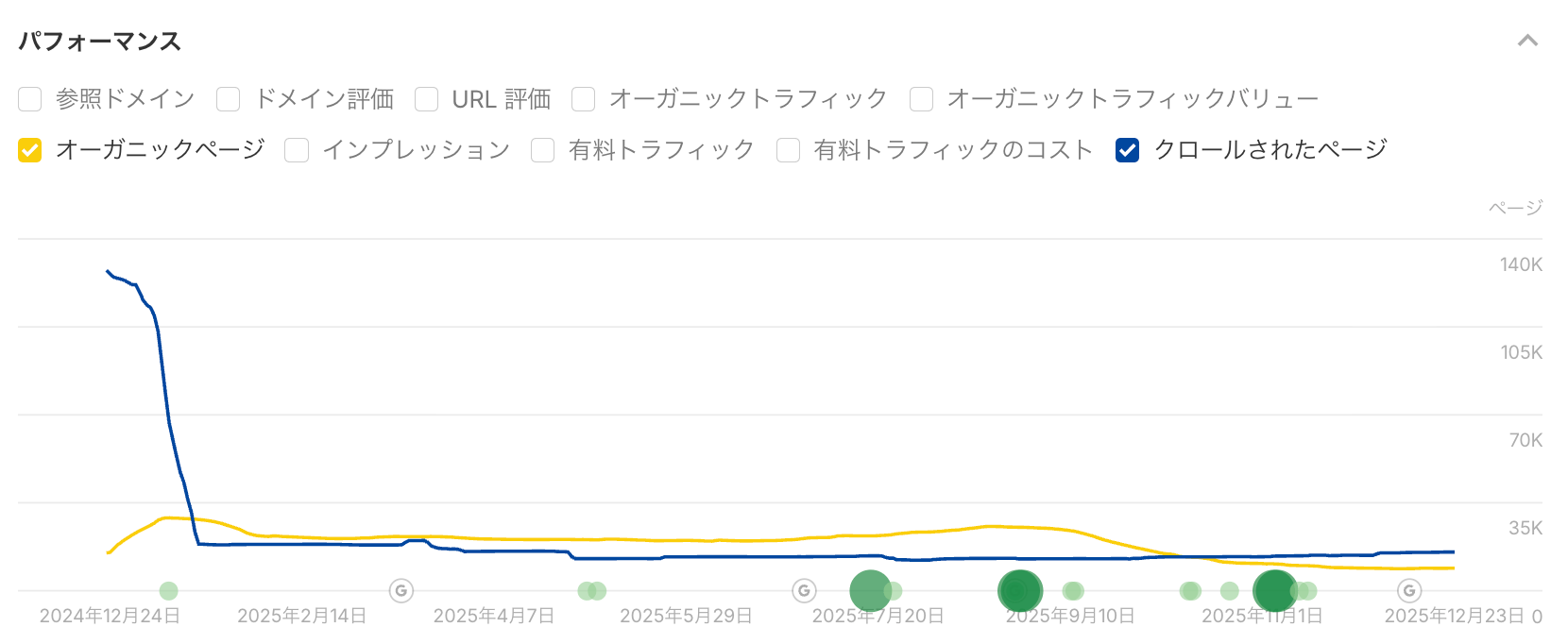 Google に無視されているコンテンツの量を確認するには、サイトエクスプローラーの「パフォーマンス」チャートで、「クロールされたページ」と「オーガニックページ」を比較してください。