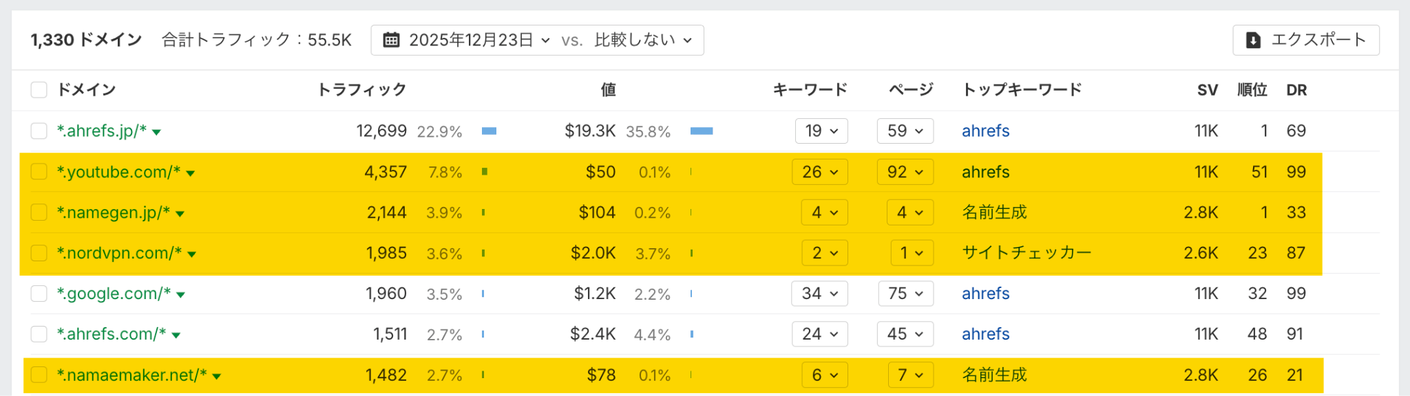 そして「トラフィックシェア」の「ドメイン別」レポートに移動すると、どのサイトが自社のトラフィックを奪っているかがわかります。Ahrefs の場合、YouTube、 namegen.jp、nordvpn、namaemaker.net、などが確認できました。