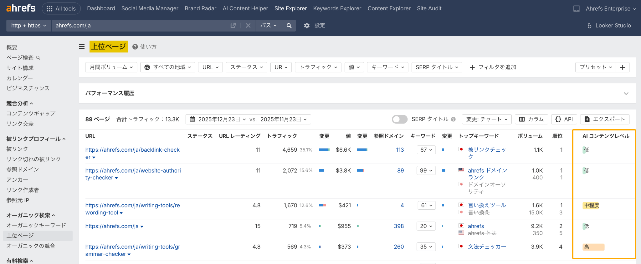任意のドメインにおけるページのAIコンテンツレベルを確認するには、サイトエクスプローラーにドメインを入力し、「上位のページ」レポートに移動して「AI コンテンツレベル」列を確認してください。