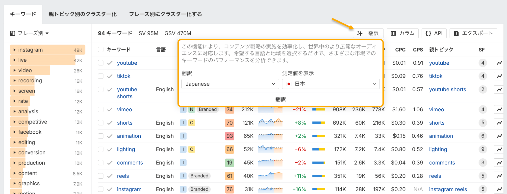 翻訳したい言語と国を選ぶと、各キーワードの翻訳候補が複数表示され、それぞれの検索ボリュームなどの指標も確認できます。その中から、最も検索されているものを選びましょう。