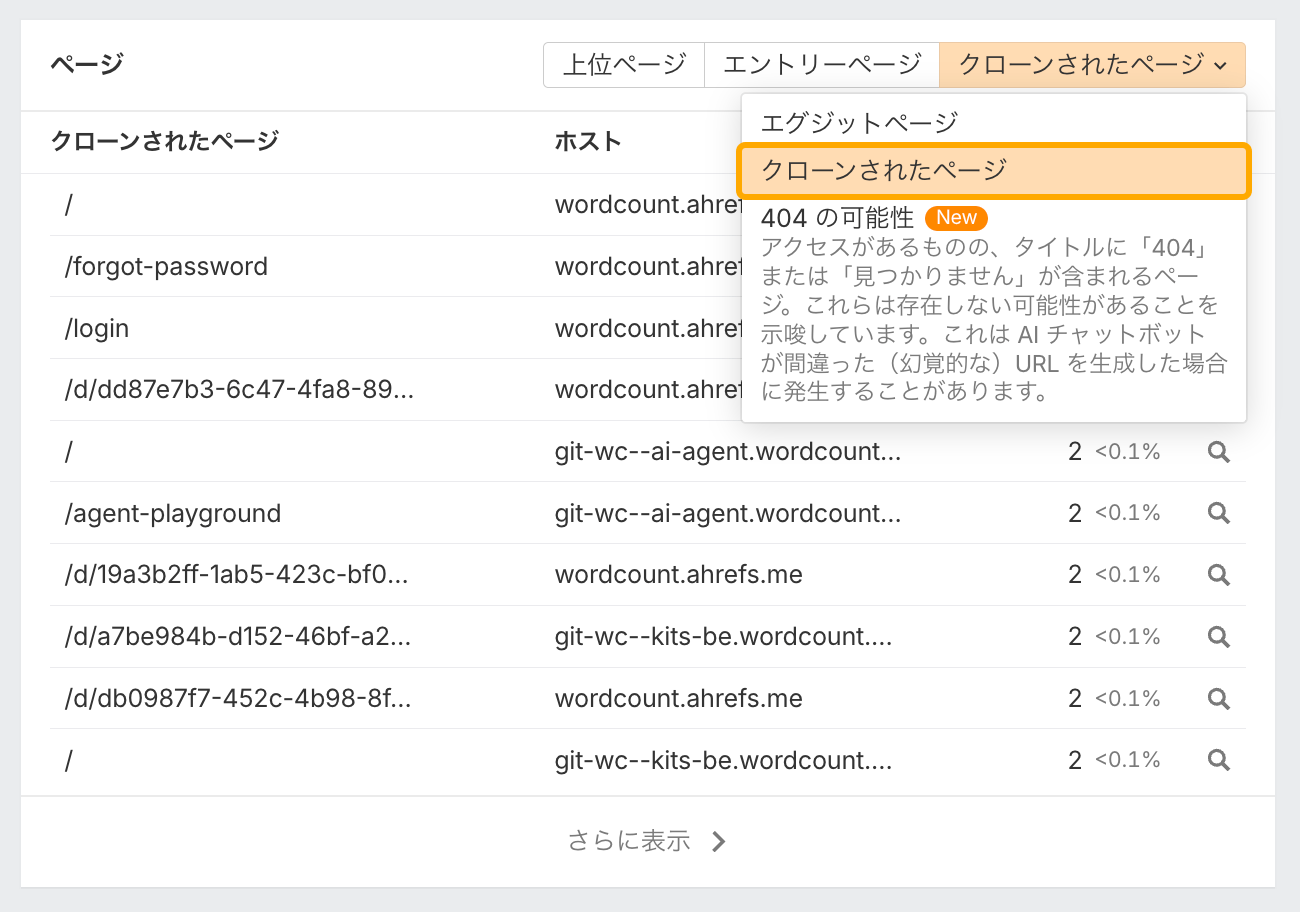 これが起こるのを防ぐには、ドメインの Ahrefs ウェブアナリティクスを開き、「クローンされたページ」に移動します。