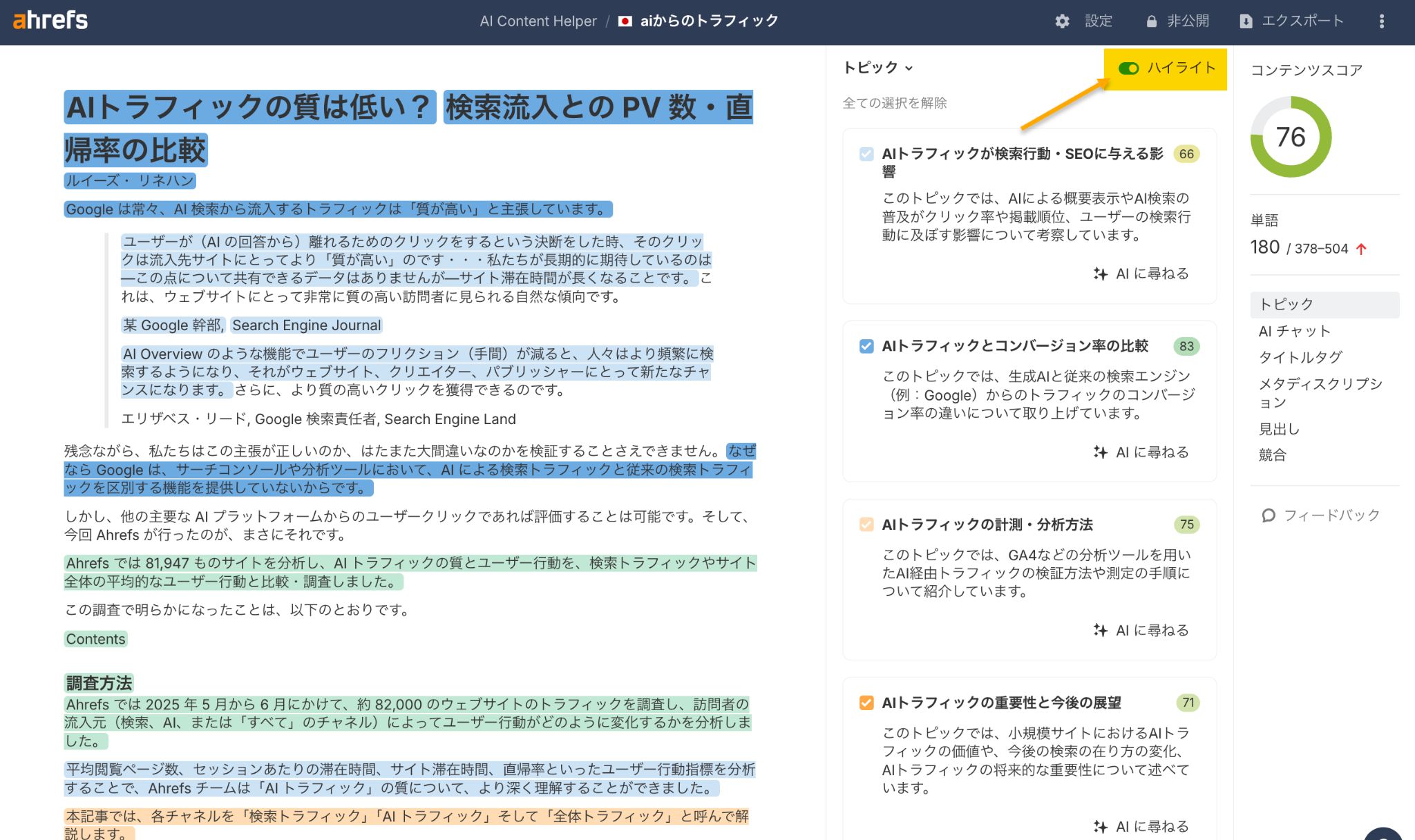 次に、ハイライトを切り替えて、文単位でトピックカバレッジを視覚化します。