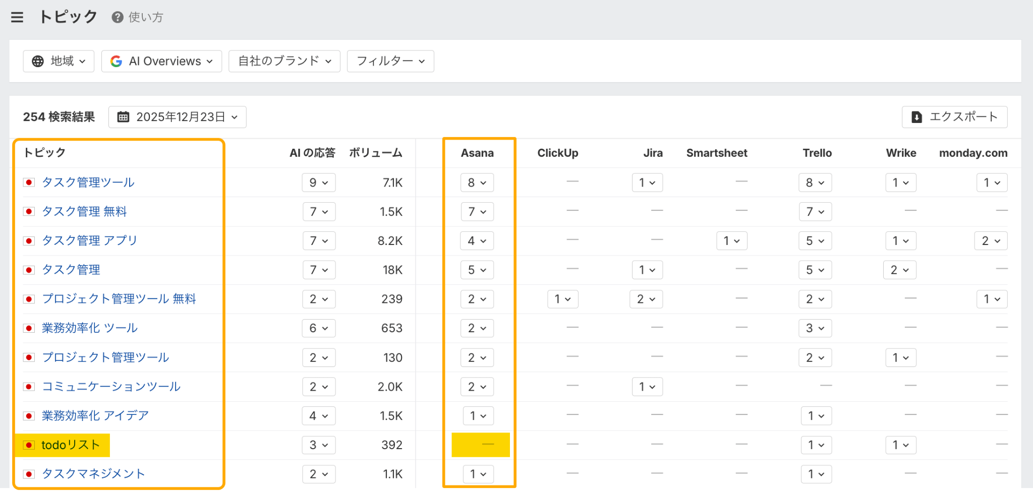同じタスク管理ツール分野の他社ツールと Asana の AI プレゼンスを比較してみると、「todo リスト」というトピックに関しては、AI による概要 と Copilot に表示されていないことがわかります。