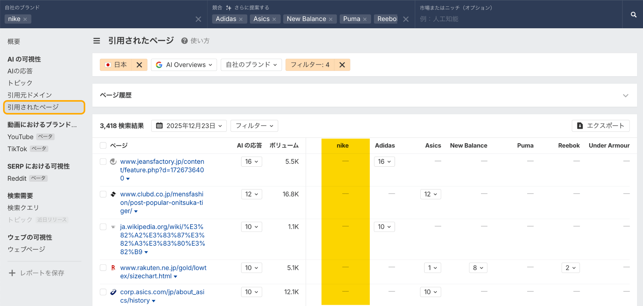 AI 引用ギャップ(競合他社は AI 回答で引用されているがあなたは引用されていない)を見つけるには、前のレポートから「引用されたページ」に移動するだけです。