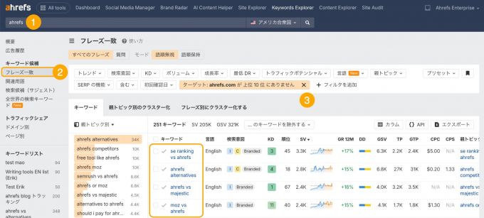 私たちの場合、Ahrefs と競合他社や代替ツールを比較する記事において、ランキングが取れていないことがわかりました。コンテンツをここに注力するべきですね。