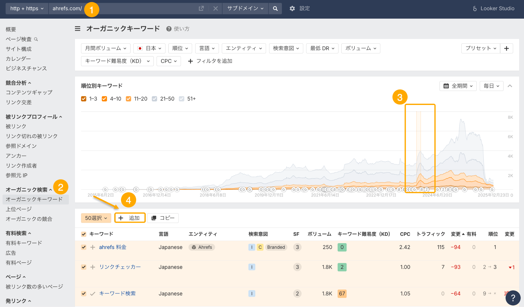 Ahrefs のブログページで調査を進めて結果を紹介します。少し複雑なプロセスではありますが、以下をご確認ください。