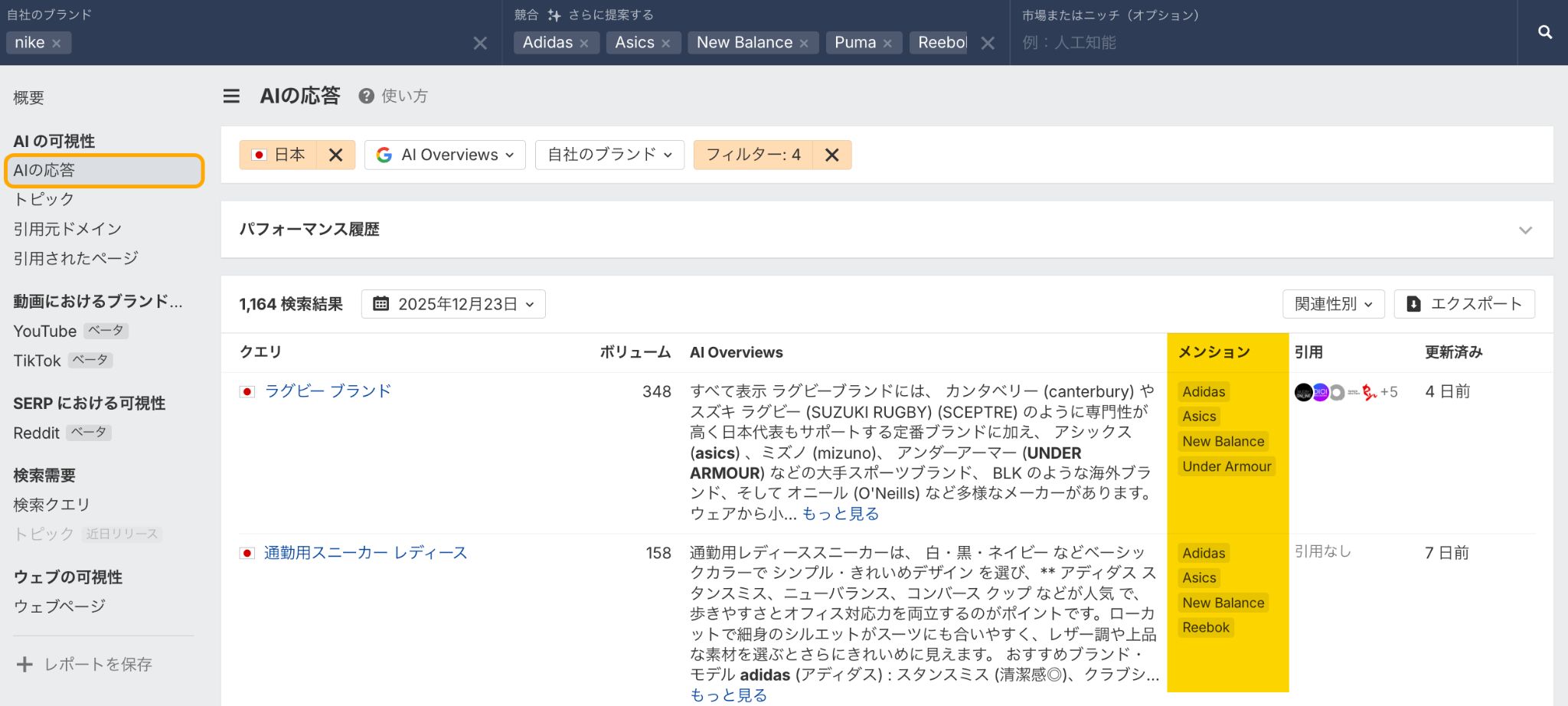 次に、「AI の応答」に移動して、自社ブランドも言及されるべきなコンテンツを確認していきます。