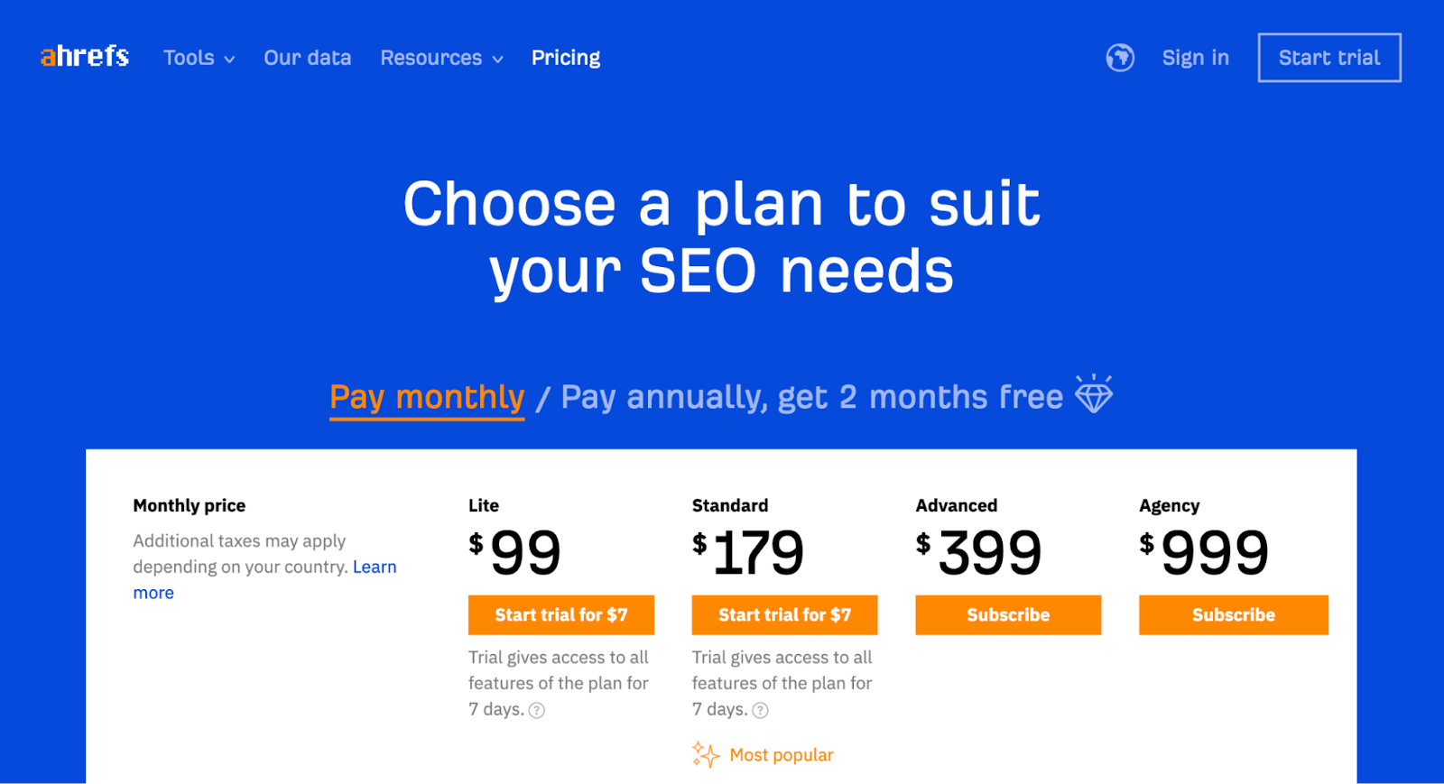 The process itself is pretty straightforward. Just price up all the resources you just talked about in a spreadsheet. This is simple enough for SEO tools and software as most of them have public pricing pages. Just pick the plan that’s right for you.