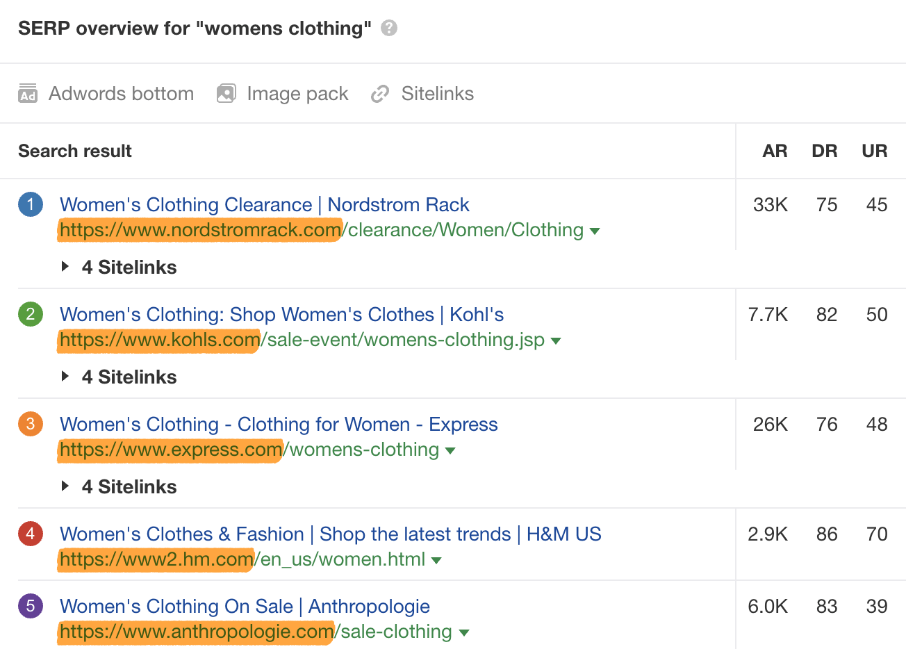 In Ahrefs, we have a metric called Domain Rating (DR) that represents a website’s authority based on the strength of its backlink profile. This isn’t factored into our KD score, but, as a general rule, you might find it hard to rank if the top results for a keyword come from sites with wildly higher DR scores than yours.