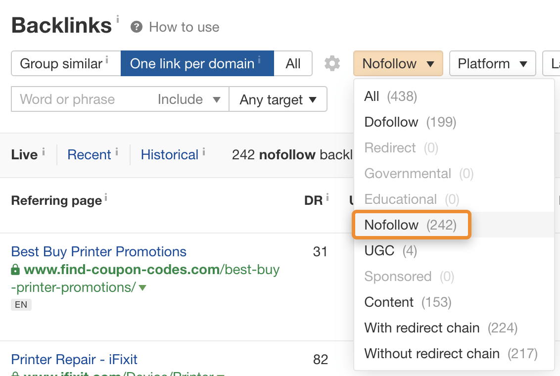 It initially looks like quite a hard keyword to crack because the top-ranking page has links from lots of websites. But if we check its backlinks in Ahrefs’ Site Explorer, most of them are low-quality and nofollowed.