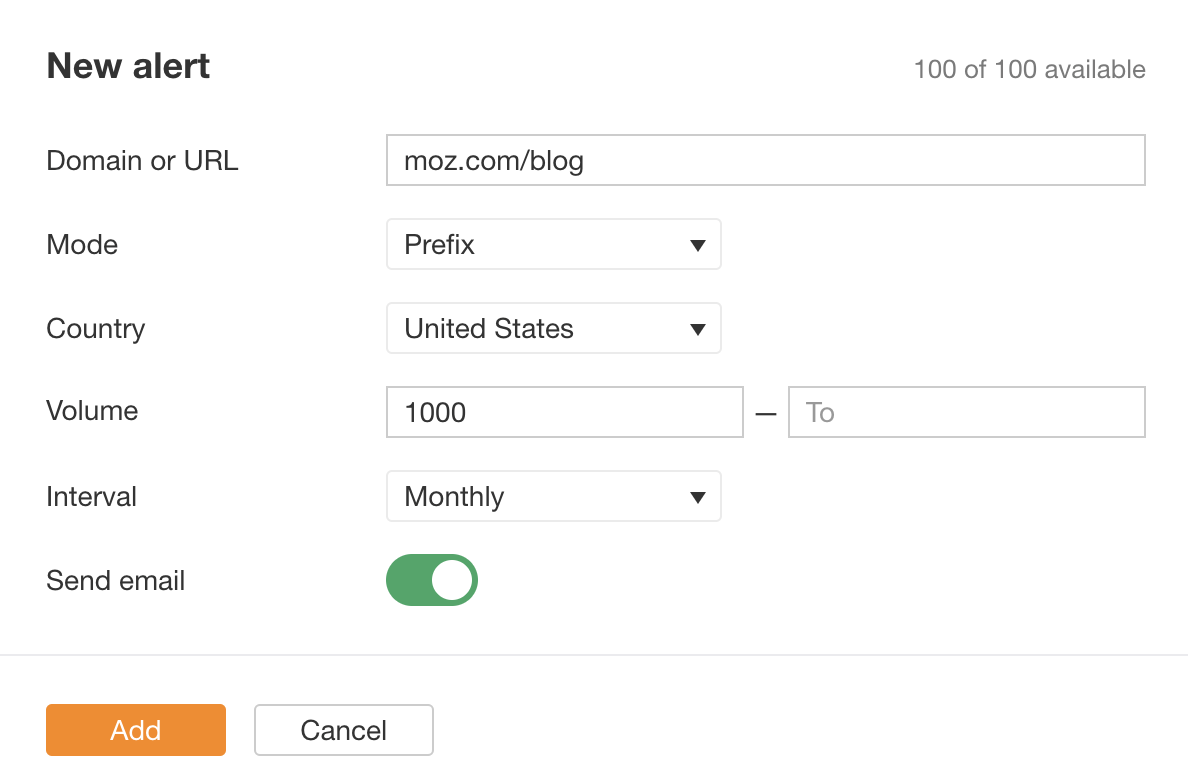 Alternatively, once you know your competitors, you can set up keyword alerts to keep tabs on new keywords they’re ranking for—and possibly targeting. To do this, set up a new keywords alert in Ahrefs Alerts. Enter a competitor, select a country, choose the search volume range and alert frequency, and you’re off to the races.