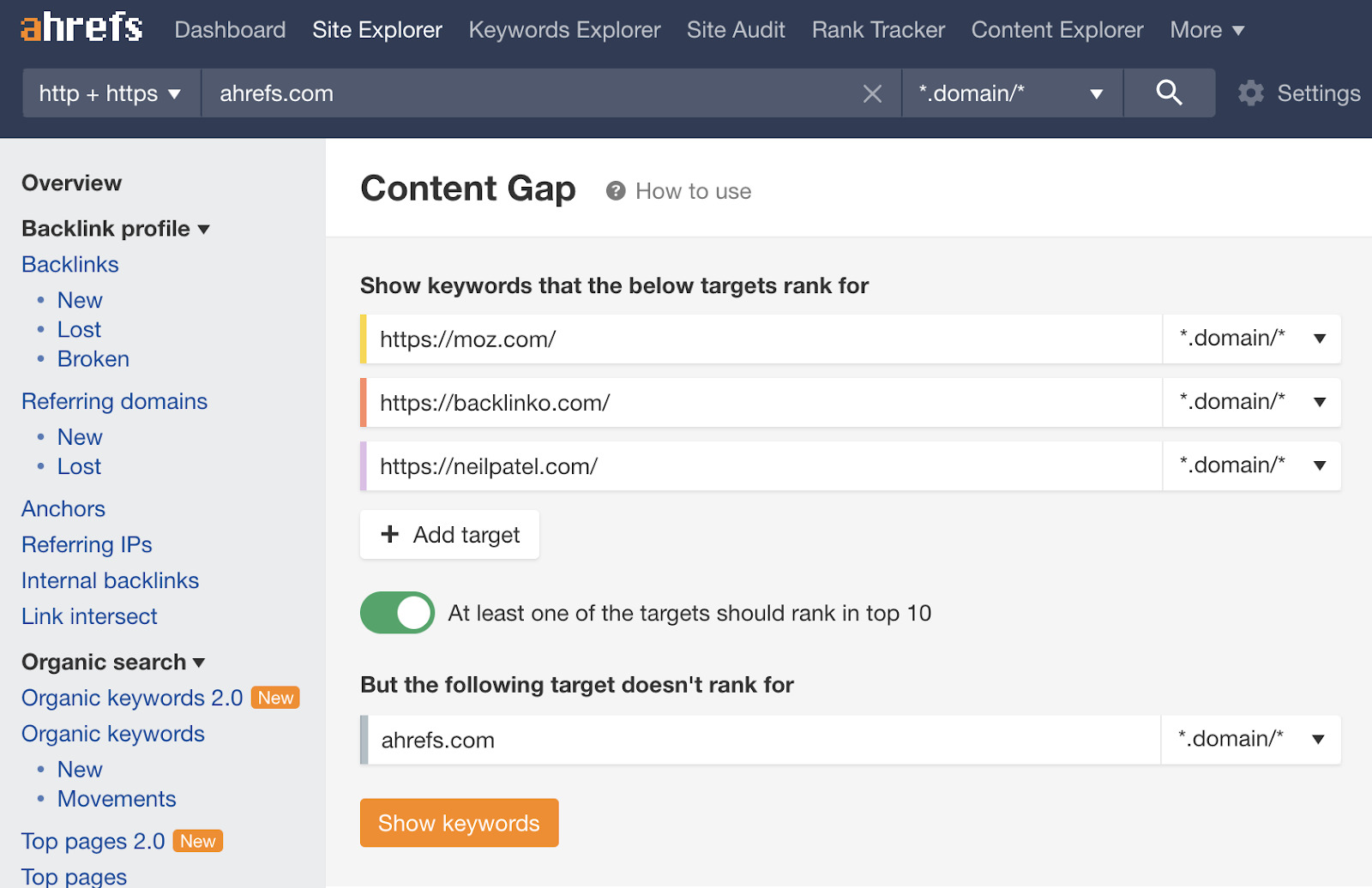 If you only want to see keywords that competitors rank for with a particular section of their website, enter a subdomain or subfolder instead. For example, if we were running a keyword competition analysis for the Ahrefs Blog, we might plug in competitors like Backlinko and Moz. But as we’re only interested in blog content, we’d want to analyze moz.com/blog instead of moz.com as all of their blog post URLs include that prefix.