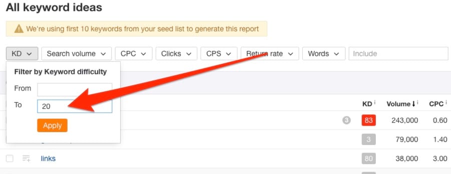 Pick out ten of your favorite, most promising keywords from your list and paste them into Keywords Explorer.