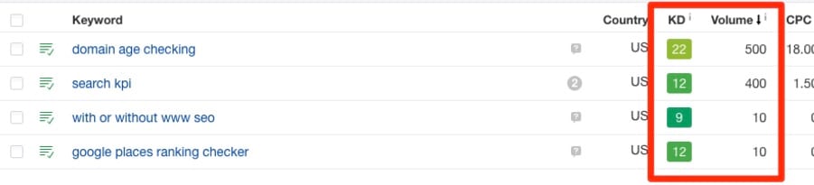 Most of these keywords are also pretty easy to rank for (i.e. they have a low KD score).